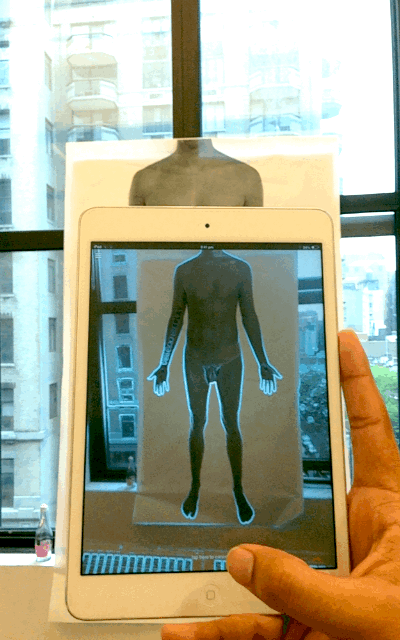 Vulgar Display is represented literally through a life size display of a naked man. Scan the torso with Layar to find the real story- etched right on the body.